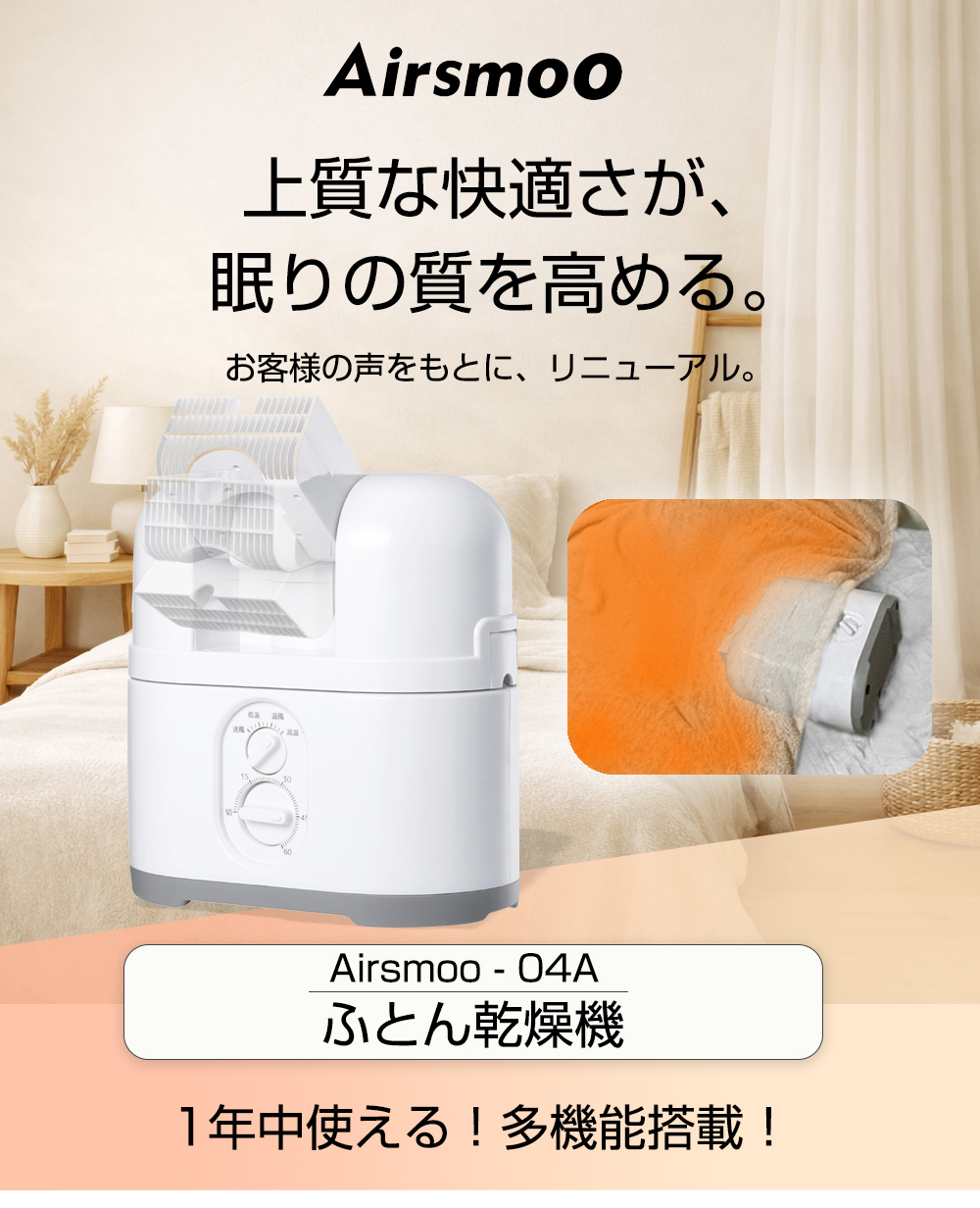 ふとん乾燥機 Airsmoo-04A (エアスムー) セット コンパクト 寒さ対策 足 小型 乾燥 (髪 靴 くつ スニーカー ブーツ ベッド) 部屋干し ホースなし 温風機能 デカ暖 小型乾燥機【正規販売代理店】